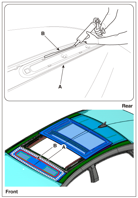 С помощью пистолета для герметика нанесите герметик (B) вокруг панели кузова (A).