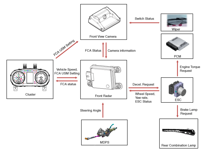 Система использует камеру, установленную на лобовом стекле, и радар на переднем бампере. контролировать условия движения перед автомобилем. Система может работать неправильно если какая-либо ситуация выходит за пределы диапазона обнаружения или может работать неправильно.