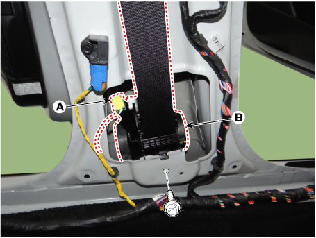 Разъедините разъем подушки безопасности (А), ослабьте болт крепления и снимите натяжитель переднего ремня безопасности (В).