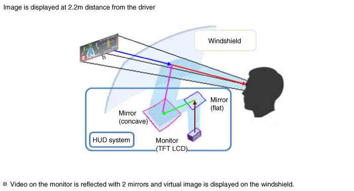 Проекционный дисплей отображает изображения TFT LCD на два зеркала (плоское/вогнутое). и отображает их на расстоянии 2,2 м от глаз водителя.