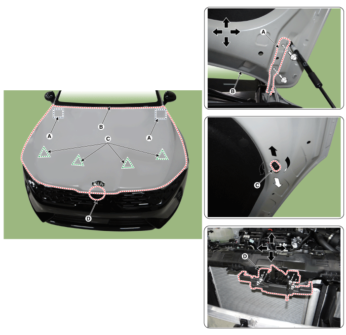 Отрегулируйте высоту капота, сдвинув амортизаторы капота (C) вверх и вниз. |
