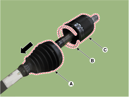 Снимите стопорное кольцо шарнира (B) и корпус шарнира (C) после отделения пыльник бокового шарнира коробки передач (A) в направлении, указанном стрелкой.