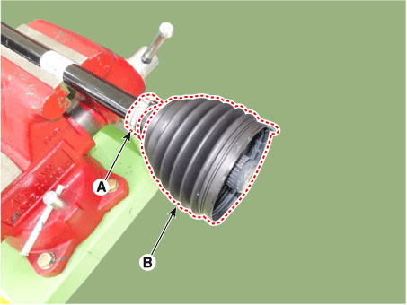 Установите хомут (А) и чехол (В) со стороны колеса на карданный вал.