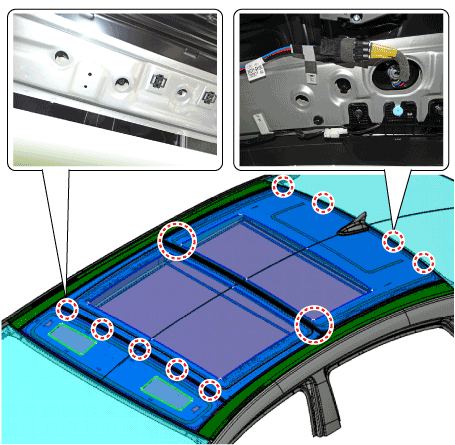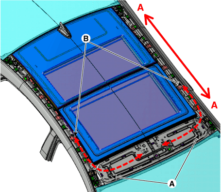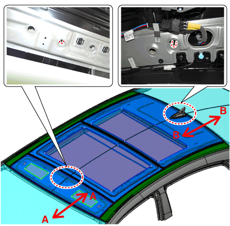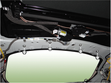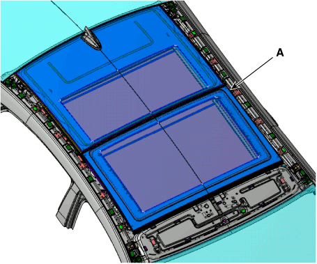 Ослабьте гайки крепления панорамного люка (А). [Передний]