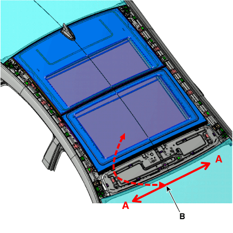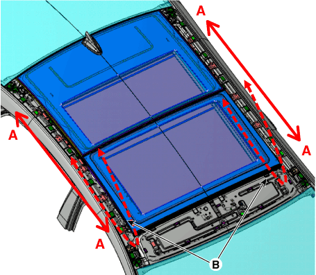 После того, как каждый боковой герметик будет срезан, снимите панорамный люк в сборе. (А).