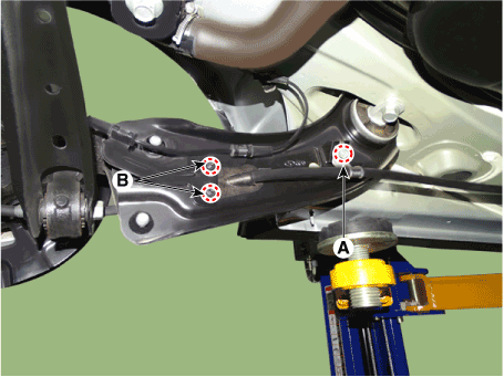 Ослабьте крепежный болт (А) и гайки (В) кронштейна троса стояночного тормоза.