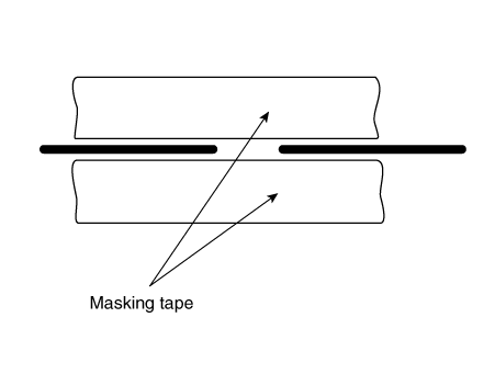Используя тонкую кисть: Протрите стекло рядом с оборванным трубопроводом отопителя, очистите силиконом съемник и прикрепите клейкую ленту, как показано на рисунке. Встряхнуть токопроводящую краску контейнер и нанесите три слоя кистью с интервалами примерно 15 минут друг от друга. Удалите ленту и дайте достаточно времени для высыхания, прежде чем применение силы. Для лучшей отделки соскребите лишнюю краску ножом. после полного высыхания краски. (Разрешить 24 часа).