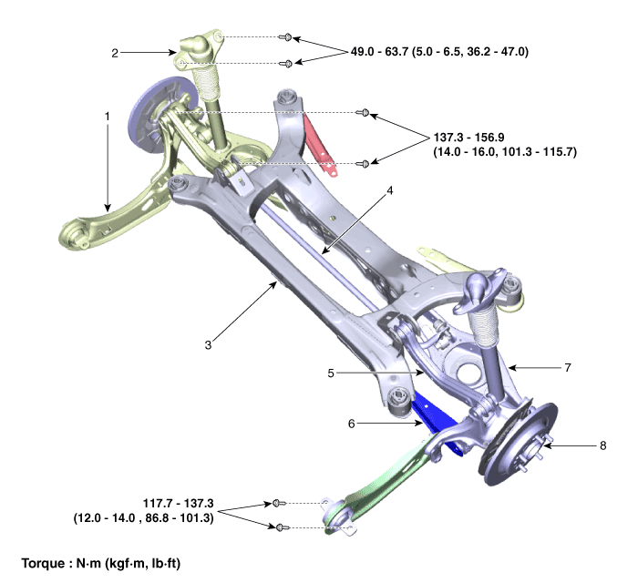 6. Задний вспомогательный рычаг 7. Задний нижний рычаг 8. Задний мост в сборе |