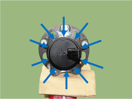 Снимите крышку датчика, ударив молотком по зазору между крышкой датчика и ступицей. подшипник в сборе с помощью скребка (A).
