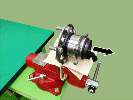 Закрепите узел подшипника задней ступицы (А) в тисках.