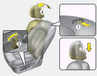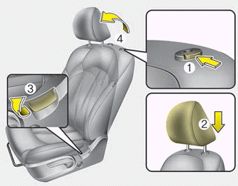 3. Нажмите кнопку фиксатора подголовника (3), потянув подголовник вверх (4).