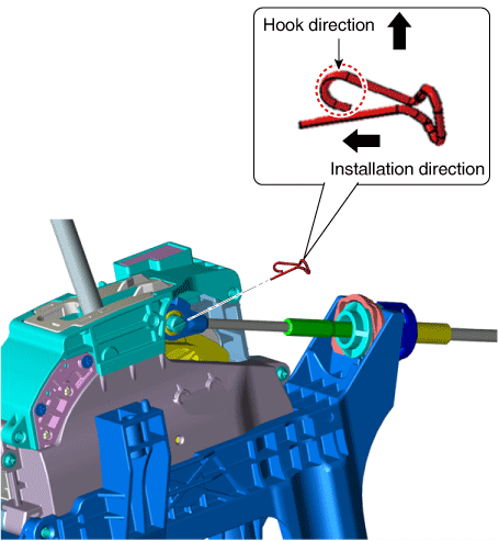 Вставьте стопорный штифт (А) после установки троса переключения передач.