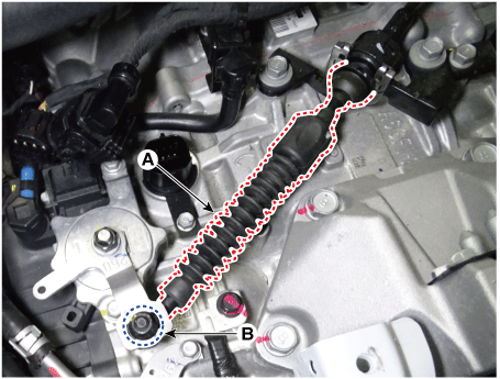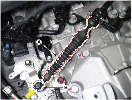 Снимите трос переключения передач (А) с кронштейна, ослабив гайку (В).