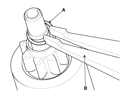 После снятия стопорного кольца (A) с помощью плоскогубцев (B).