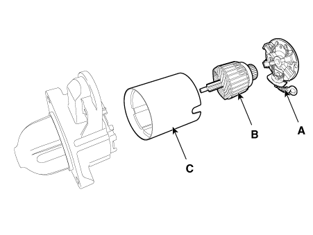 Снимите узел щеткодержателя (A), узел якоря (B) и вилку. сборка (С).