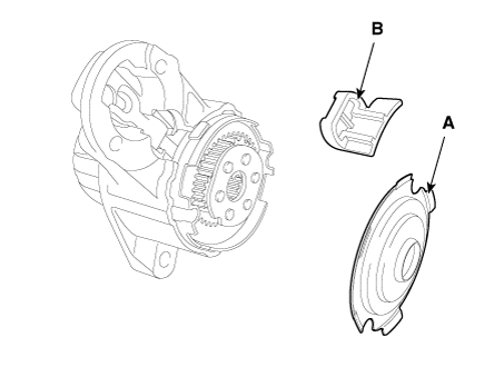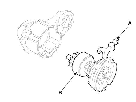 Отсоедините кабель стартера (А) от клеммы В соленоида, затем отсоедините разъем (B) от клеммы S.