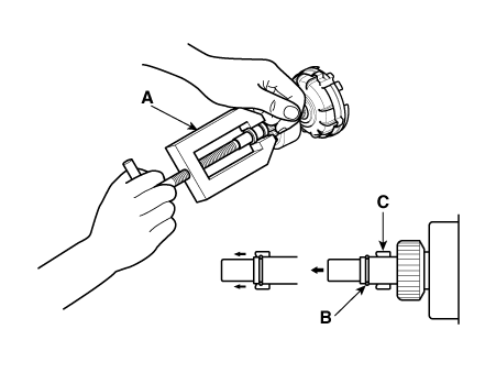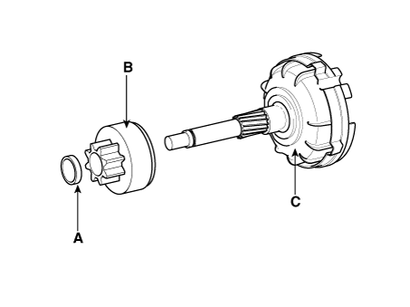 Отсоедините стопор (А), обгонную муфту (В) и внутреннюю шестерню. (С).