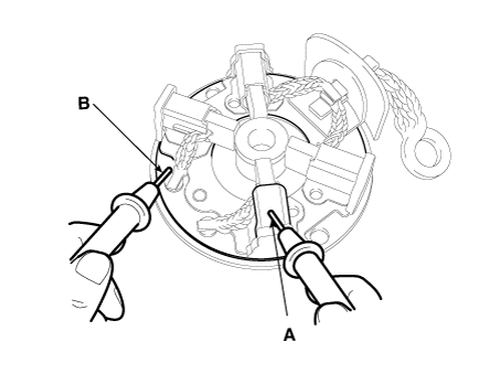 Убедитесь в отсутствии непрерывности между (+) щеткодержателем (A) и (-) пластиной. (Б). При наличии непрерывности замените узел щеткодержателя.