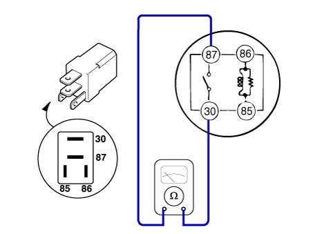 Подайте 12 В на клемму 85 и заземлите на клемму 86, а затем проверьте для непрерывности между клеммами (30 и 87).