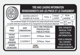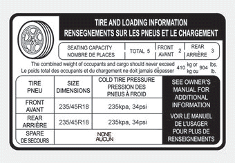 На наклейке, расположенной на пороге двери водителя, указан исходный размер шин в холодном состоянии. давление в шинах, рекомендуемое для вашего автомобиля, количество людей, которые могут находиться в ваш автомобиль и грузоподъемность автомобиля.