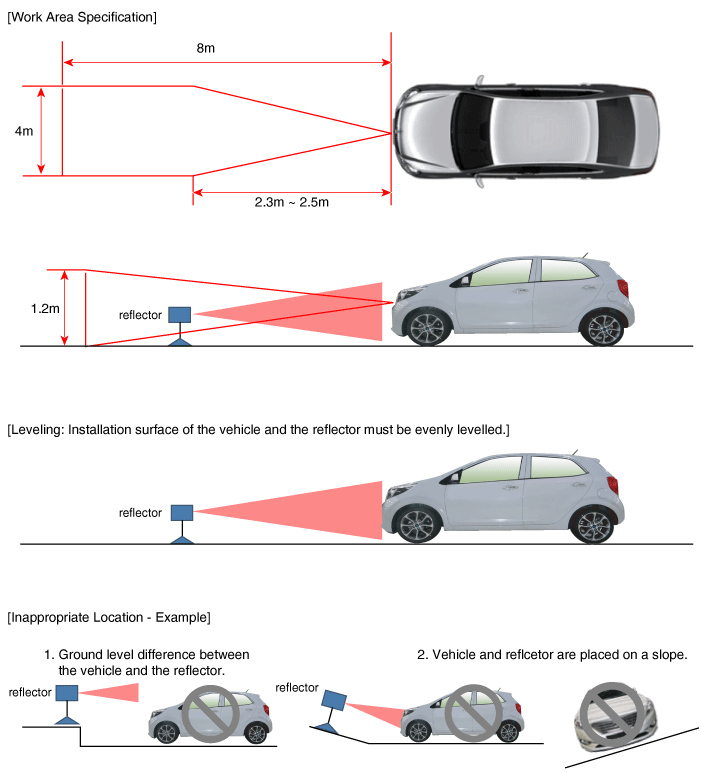 Регулировка может быть неточной, если автомобиль и отражатель расположены на разных уровнях земли или на склоне.