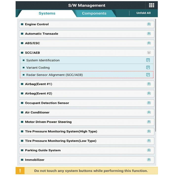 После правильного выбора модели автомобиля выберите «Выравнивание FCA» из вспомогательных функций в меню KDS.