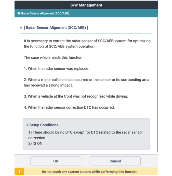 В Для правильной работы радарного датчика он должен быть правильно параллельно направлению движения автомобиля.Для этого По этой причине необходимо выполнить процедуру юстировки радарного датчика. всякий раз, когда датчик был переустановлен или заменен новым.