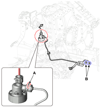 Ослабьте болты кронштейна трубы сцепления (В) и затем снимите стопорный штифт (А) с регулятора.