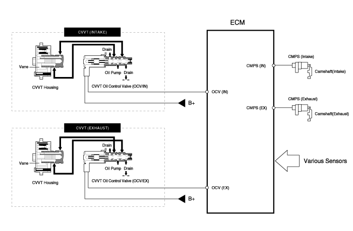 Клапан управления маслом CVVT (OCV), который подает моторное масло на кулачок.