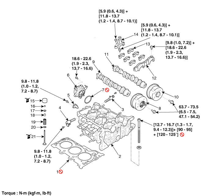 2. Головка блока цилиндров 3. Впускной масляный клапан (OCV) 4. Клапан управления выхлопным маслом (OCV) 5. Датчик положения выпускного распределительного вала (CMPS) 6. Вакуумный насос 7. Уплотнительное кольцо вакуумного насоса |