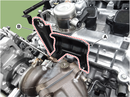 Снимите теплозащитный щиток (А) и подвеску двигателя (В).