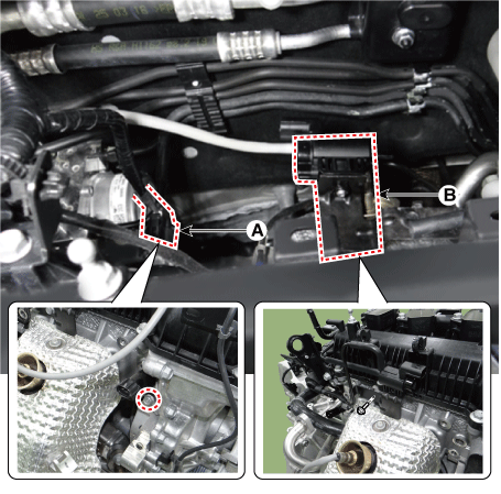 Ослабьте болт и снимите кронштейн клапана управления маслом CVVT (A) и кронштейн разъема (B).