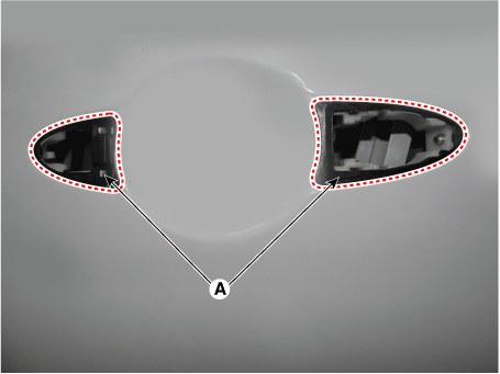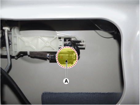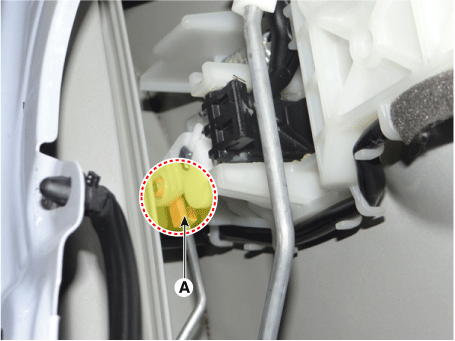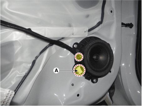Отсоедините разъем динамика передней двери (А), а затем снимите зажимы крепления проводки.
