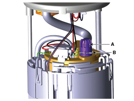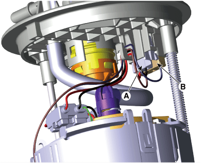 Отсоедините разъем электродвигателя топливного насоса (А) и разъем датчика уровня топлива (В).