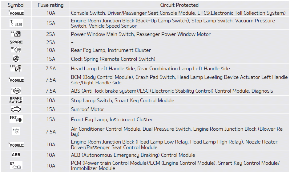 Внутри крышек панели предохранителей/реле вы можно найти этикетку предохранителя/реле, описывающую имя и мощность предохранителя/реле.