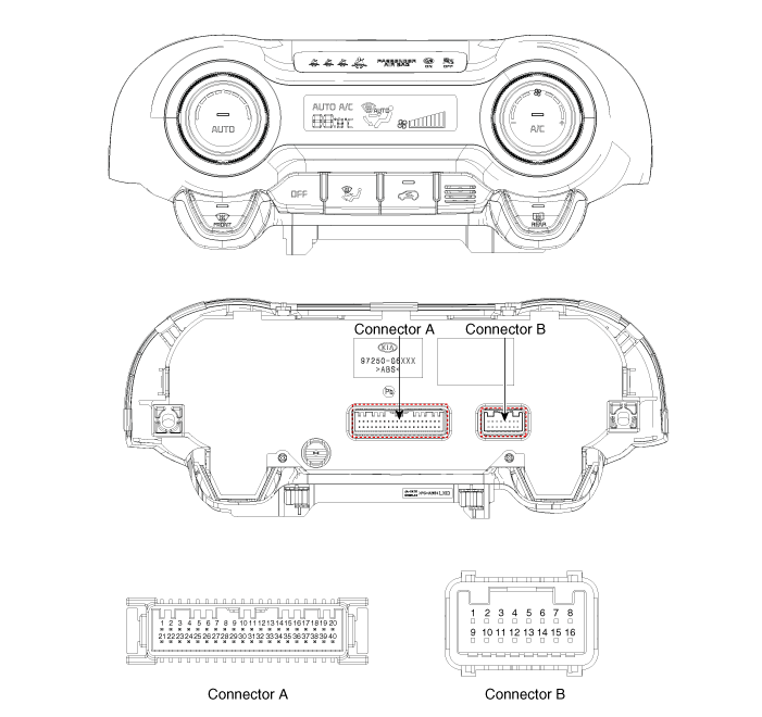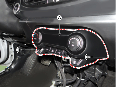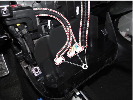 Отсоедините разъемы (А) отопителя и блока управления кондиционером.