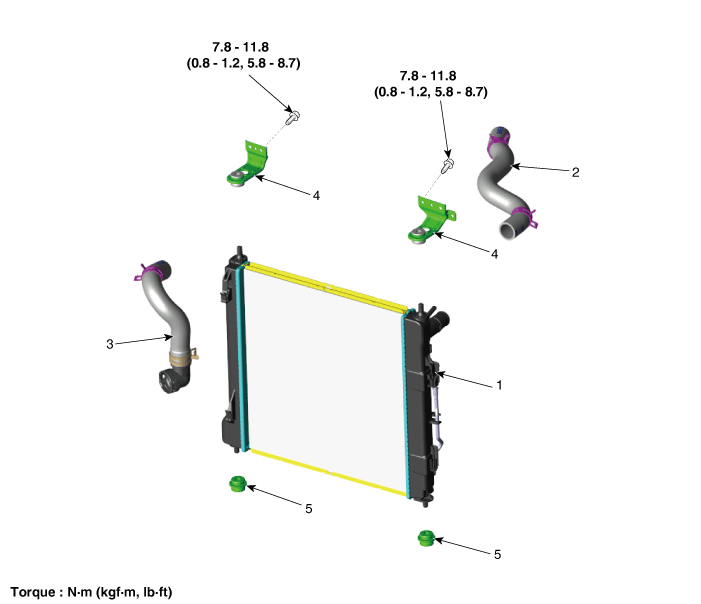 2. Верхний шланг радиатора 3. Нижний шланг радиатора |