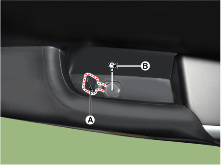 Ослабьте винт (B) после открытия колпачка ручки тяги задней двери (A).