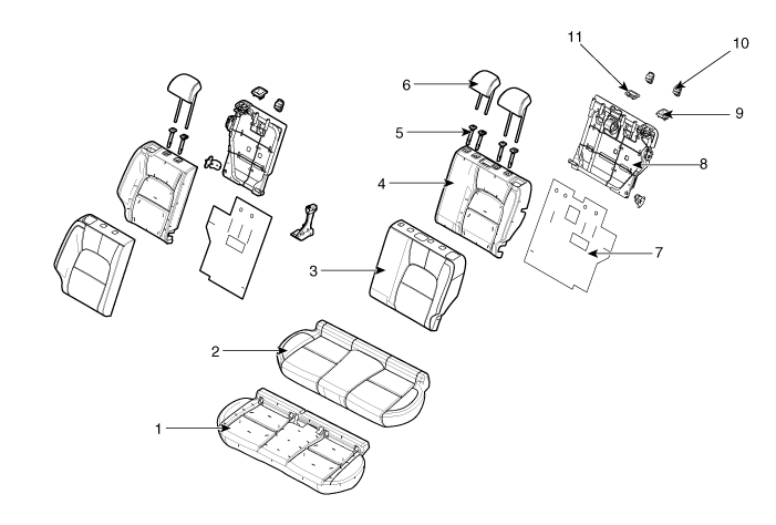 8. Каркас спинки заднего сиденья 9. Верхняя рамка спинки заднего сиденья 10. Крышка анкера крепления спинки заднего сиденья 11. Направляющая ремня спинки заднего сиденья. |