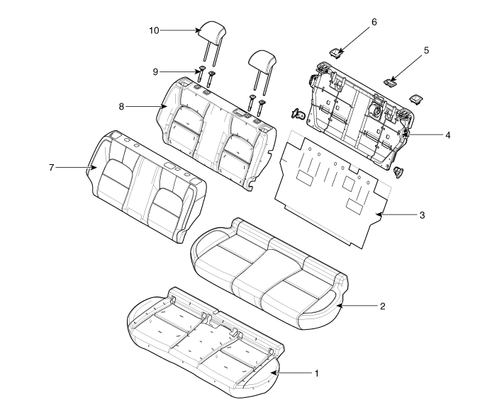 7. Обшивка спинки заднего сиденья 8. Подушка спинки заднего сиденья 9. Направляющая подголовника заднего сиденья 10. Подголовник заднего сиденья |