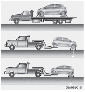 Если необходима аварийная буксировка, мы порекомендуйте, чтобы это сделал авторизованный Дилер Киа или коммерческий услуги эвакуатора. Правильный подъем и Процедуры буксировки необходимы для предотвратить повреждение автомобиля. Использование рекомендуется колесная тележка (1) или платформа.