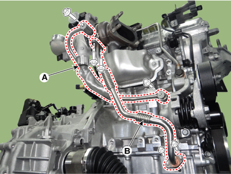 Снимите верхнюю опору (A) каталитического нейтрализатора прогрева (WCC), а затем снимите каталитический нейтрализатор прогрева (WCC) (B).