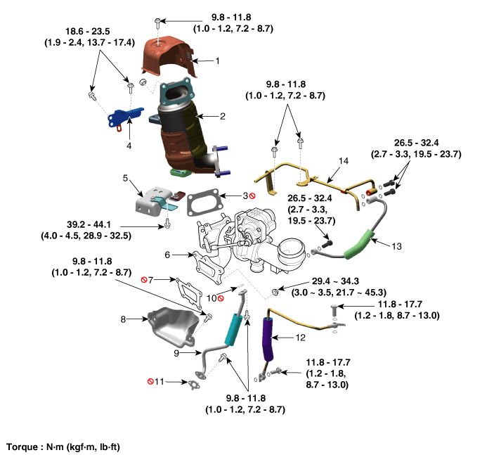 2. Прогрев каталитического нейтрализатора (WCC) 3. Прокладка каталитического нейтрализатора прогрева (WCC) 4. Верхняя опора каталитического нейтрализатора прогрева (WCC) 5. Верхняя опора выпускного коллектора 6. Коллектор турбонагнетателя 7. Прокладка коллектора турбонагнетателя |