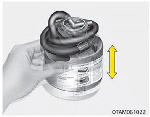 7. Вставьте бутыль с герметиком в корпус (5) компрессора так что бутылка стоит вертикально.
