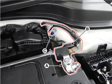 Отсоедините отрицательную (-) клемму (А) аккумуляторной батареи.