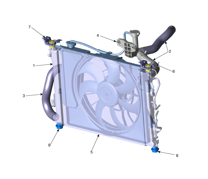 7. Верхний монтажный кронштейн радиатора [правый] 8. Изолятор нижнего крепления радиатора [LH] 9. Изолятор нижнего крепления радиатора [RH] |