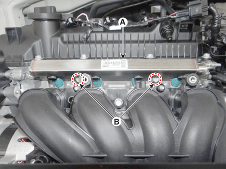 Снимите установочные гайки (В), а затем отсоедините трубку подачи топлива. (А).