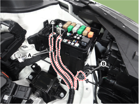 Отсоедините проводной кабель блока предохранителей (А) и передний разъем (В).