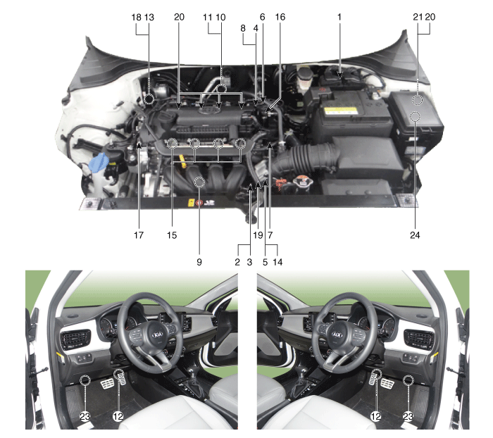 14. Двигатель ETC [встроен в модуль ETC] 15 . Инжектор 16 . Электромагнитный клапан управления продувкой (PCSV) 17 . Соленоид переменной силы (VFS) [ряд 1 / впуск] 18 . Клапан управления маслом CVVT (OCV) [ряд 1 / выпуск] 19. Электромагнитный клапан переменного впуска (VIS) 20 . Катушка зажигания 21. Главное реле 22. Реле топливного насоса 23. Разъем канала передачи данных (DLC) [16-контактный] 24. Многоцелевой контрольный разъем [6 контактов] |