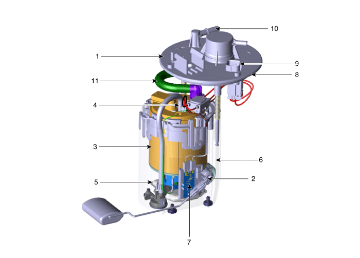 8. Уплотнение пластины топливного насоса 9. Двигатель топливного насоса и разъем датчика уровня топлива 10. Порт подачи топлива 11. Трубка подачи топлива |